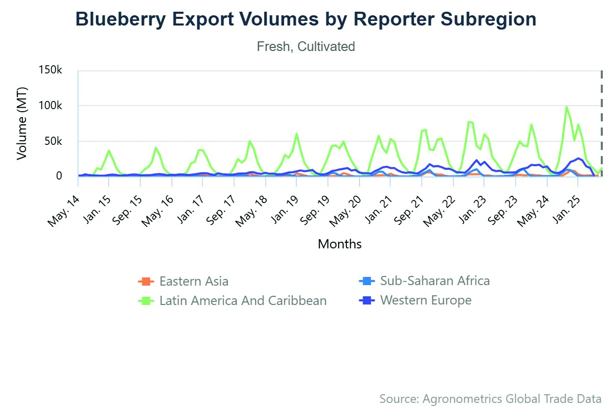 América Latina —Chile primero y Perú después— ha liderado las exportaciones de arándanos en los últimos años.