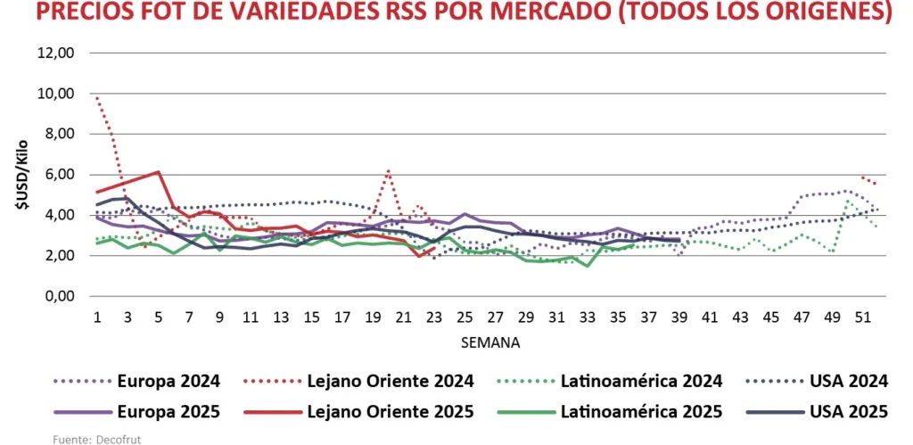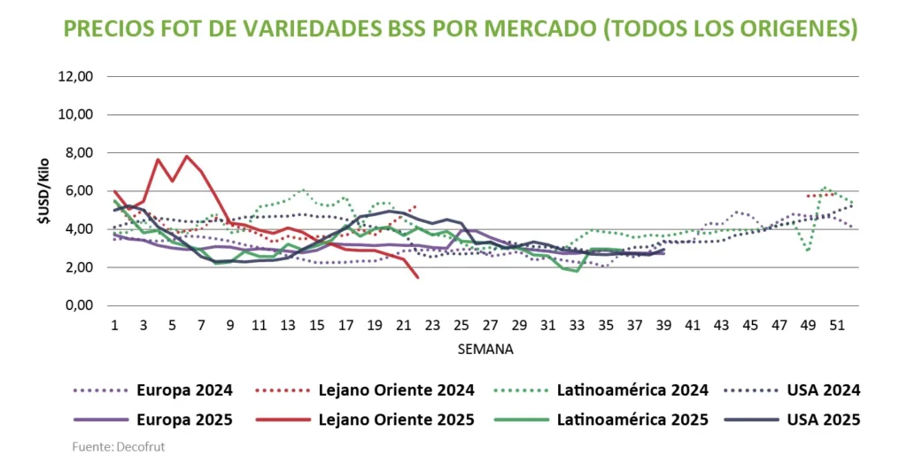 En cuanto a Latinoamérica, su mercado podría funcionar como un amortiguador parcial para redirigir una fracción de los volúmenes, con el objetivo de no saturar Europa y Estados Unidos. Esto no implica simplemente enviar fruta, sino la más adecuada, considerando tiempos de tránsito y menor complejidad regulatoria, especialmente para los oferentes dentro del mismo bloque. El desvío, no obstante, debe ser parcial: trasladar todo el remanente solo desplaza el problema de un mercado a otro, saturando la demanda y deprimiendo los precios. Cuando se “utiliza” con criterio, Latinoamérica contribuye a sostener las cotizaciones tanto en la región como en los destinos principales, reduce la presión en las semanas punta y disminuye el riesgo de reclamos por vida útil.