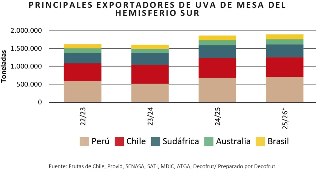 Brasil también espera seguir creciendo, con exportaciones estimadas en torno a 17 millones de cajas equivalentes de 8,2 kg. No obstante, enfrenta desafíos como la profesionalización del almacenamiento en frío y la logística, además de las tarifas arancelarias en Estados Unidos, que limitan su competitividad frente a otros orígenes. Aunque EE.UU. no es su principal destino, sigue siendo un mercado relevante —especialmente para las variedades blancas sin semilla—. Se prevé que los volúmenes no enviados a Norteamérica se distribuyan principalmente en Europa y Latinoamérica, posicionándose el primero como el principal socio comercial para su uva.