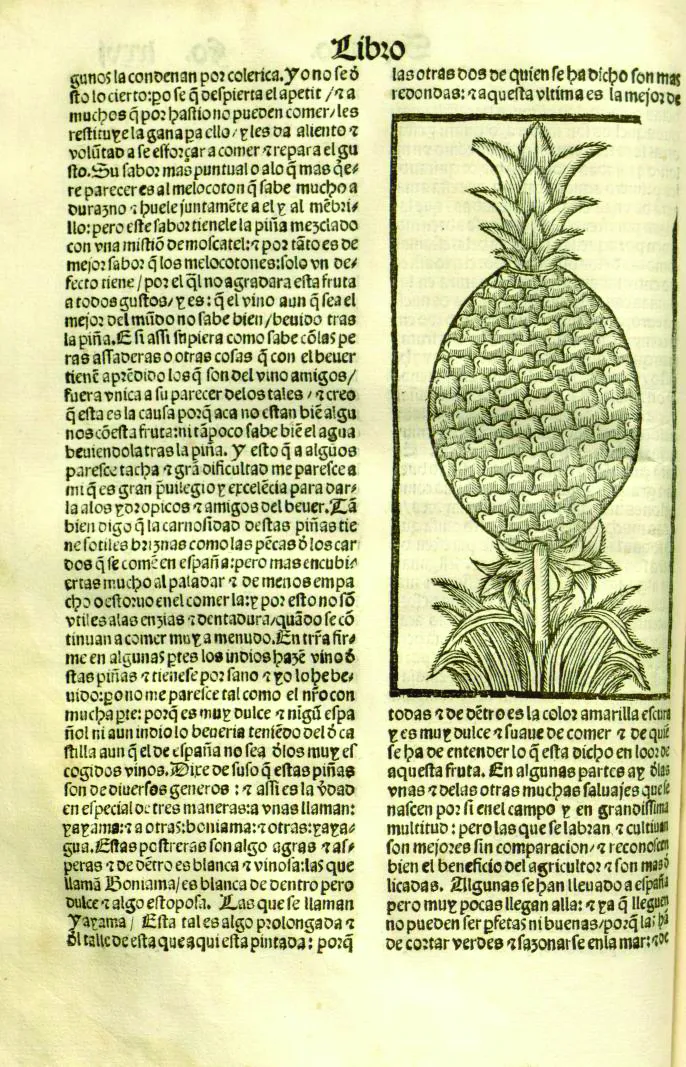 Para cuando Colón regresó a América en 1493, la piña ya estaba extendida por los territorios indígenas. Uno de sus compañeros, Michele de Cuneo, mencionó esta impresionante fruta en una carta a su amigo: “También hay plantas como la alcachofa, pero cuatro veces más altas, que dan un fruto en forma de piña de conífera, pero el doble de grande. Este fruto es excelente y se puede cortar con un cuchillo como un nabo, y parece muy saludable”.