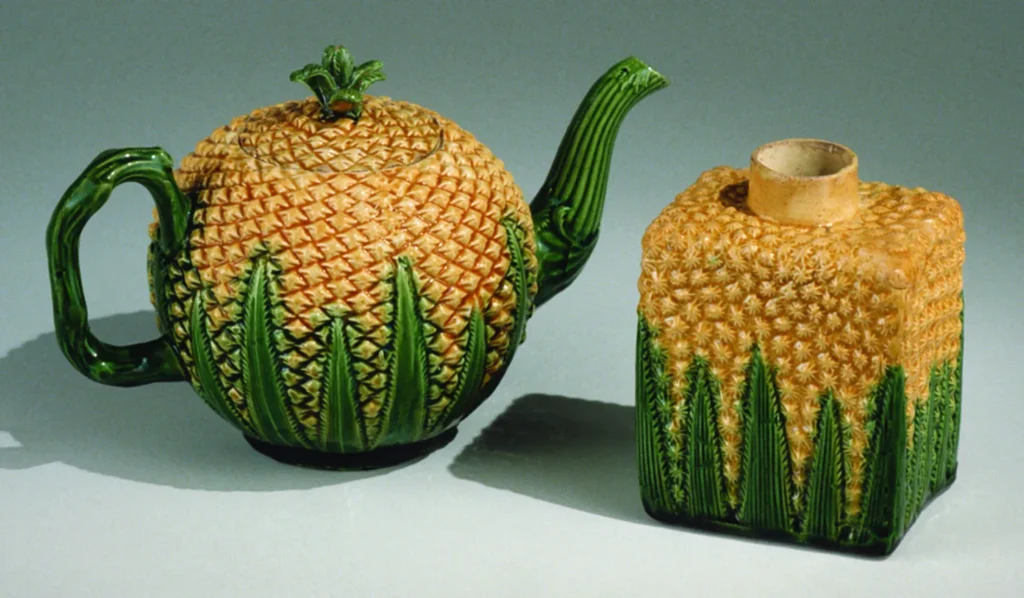 Sin embargo, las piñas frescas seguían estando fuera del alcance de la mayoría. Pero eso no impidió que la gente se diera el gusto con la segunda mejor opción: productos con temática de piña. De repente, los símbolos de la fruta estaban por todas partes: desde vajillas y cajas de té hasta marcos de puertas y centros de mesa, todos utilizados para expresar buen gusto y estatus social.