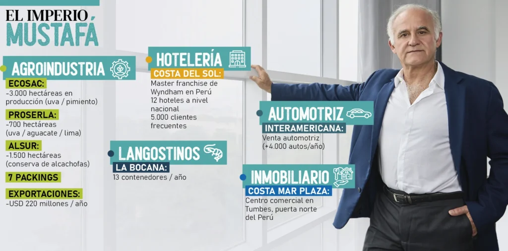 Hablar de Mario Mustafá Aguinaga es hablar de uno de los empresarios más influyentes y, al mismo tiempo, menos mediáticos del Perú. Presidente del directorio de Costa del Sol, holding que integra a Ecosac (Piura), Proserla (Chiclayo), Alsur (Arequipa y Cusco), Costa Mar Plaza (Tumbes) y la cadena Hoteles Costa del Sol (master franchise de Wyndham), Mustafá ha construido un imperio sin estridencias, guiado por la sencillez, la eficiencia y una calidez humana que sorprende en medio del vértigo de sus negocios.
